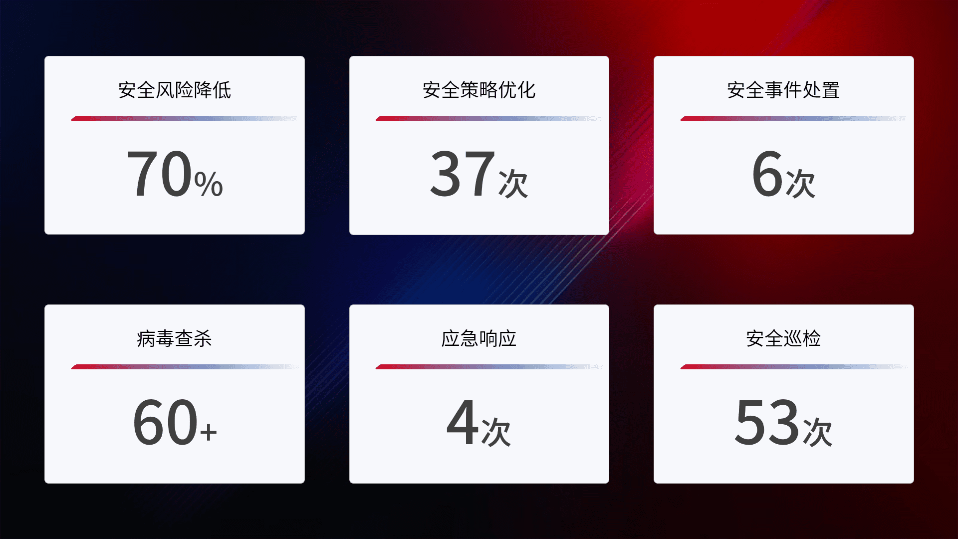 提供全面的安全事件报告体系,,包括处置报告、、周报、、、、季度和年度总结,,结合持续监控,,,帮助客户深入了解网络安全状况。。。。