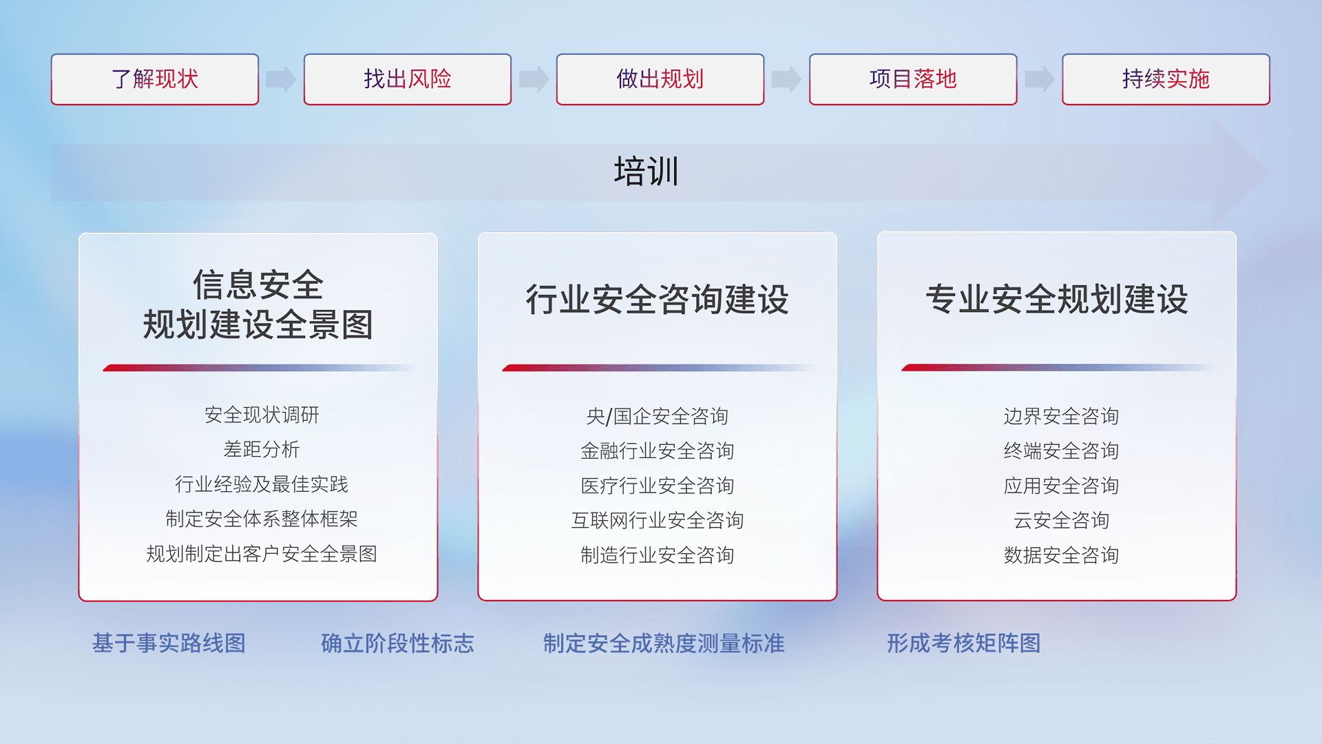 针对客户行业特性,,,以专业的安全服务+多厂商联合解决方案提供专属的一站式安全管理服务,,帮助客户全面感知网络空间威胁,,,,基于识别、、检测、、分析、、、、防护、、监测、、、响应的服务理论模型,,,从方案咨询、、、、集成交付、、评估验证、、、优化加固、、、运维运营,,,,致力于为客户提供完整的闭环管理式安全服务。。。。以实战经验为客户打造高抵御风险的安全体系,,,,帮助客户发现威胁、、、、对抗威胁、、处置威胁,,,,不断积累安全对抗能力,,持续保障数字化安全。。。